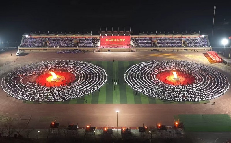 随后举行的“薪火跨年”篝火晚会将活动推向新的高潮。师生齐聚体育场,篝火点燃的瞬间,一面长50米的巨幅国旗徐徐展开,全场师生齐声高唱《我和我的祖国》,激昂的歌声将活动气氛推向顶点。热烈的篝火旁,师生手拉手载歌载舞,笑声、欢呼声与音乐交织回荡,营造出温馨且充满活力的跨年氛围,让学生在紧张学习之余充分放松身心,深切感受集体的温暖。