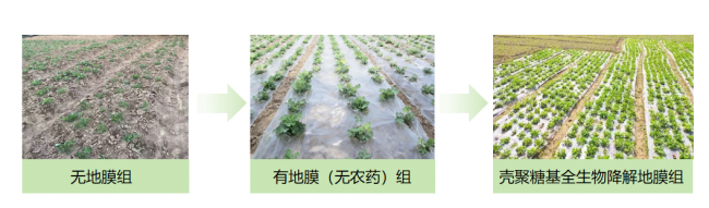 团队连续22天监测花生种子的发芽状况,每天记录幼苗出土数量与生长态势,最终汇总各组的最终发芽率:无地膜组仅为64.5%,普通地膜组约为82.3%,而壳聚糖基全生物降解地膜组高达94.6%。实验数据清晰地展现了该地膜的核心亮点:借助艾草桉叶素、侧柏酮等天然活性物质达成无农残的化学驱虫效果,壳聚糖基材确保自然可控的降解过程,两者协同作用实现抑菌护苗功能。在不使用化学农药的情况下,其保墒护苗效果胜过普通地膜,显著提高作物发芽率,同时从源头杜绝土壤残留污染,完全满足当地农户“降成本、增产量、保绿色”的关键需求。